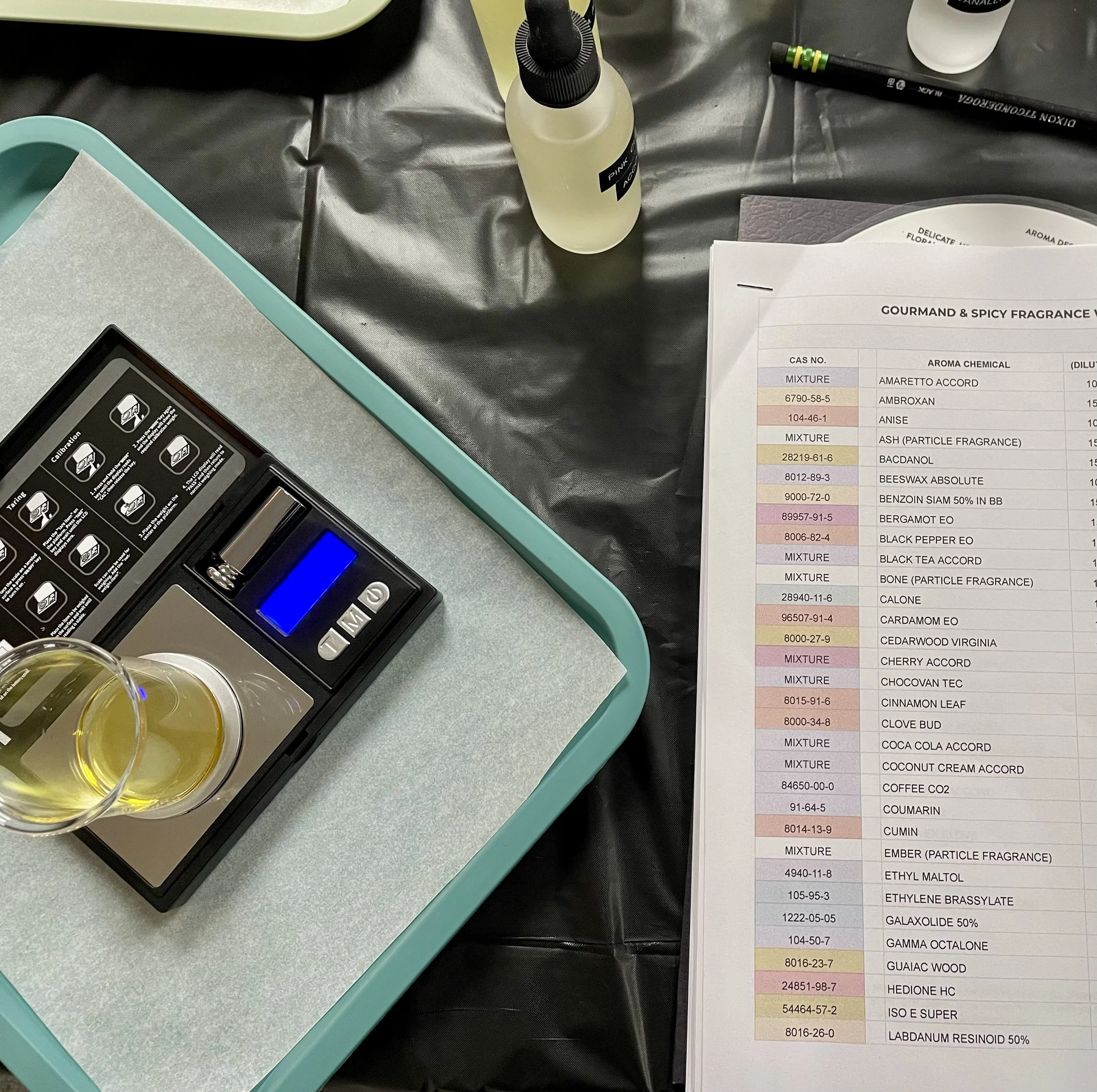 Gourmand here means culinary aromatics. My inspo was cardamom and pink peppercorn. I tried to make star anise or clove or cinnamon leaf work in my blend but they seemed overpowering. I learned about Iso E Super which is said to be the most successful synthetic fragrance ever ?! People describe it like MSG for cooking, it amplifies and makes harmonious the other aromatics? On its own it is considered “transparent” I thought it was vaguely woodsy? Of course, I used it in my blend.